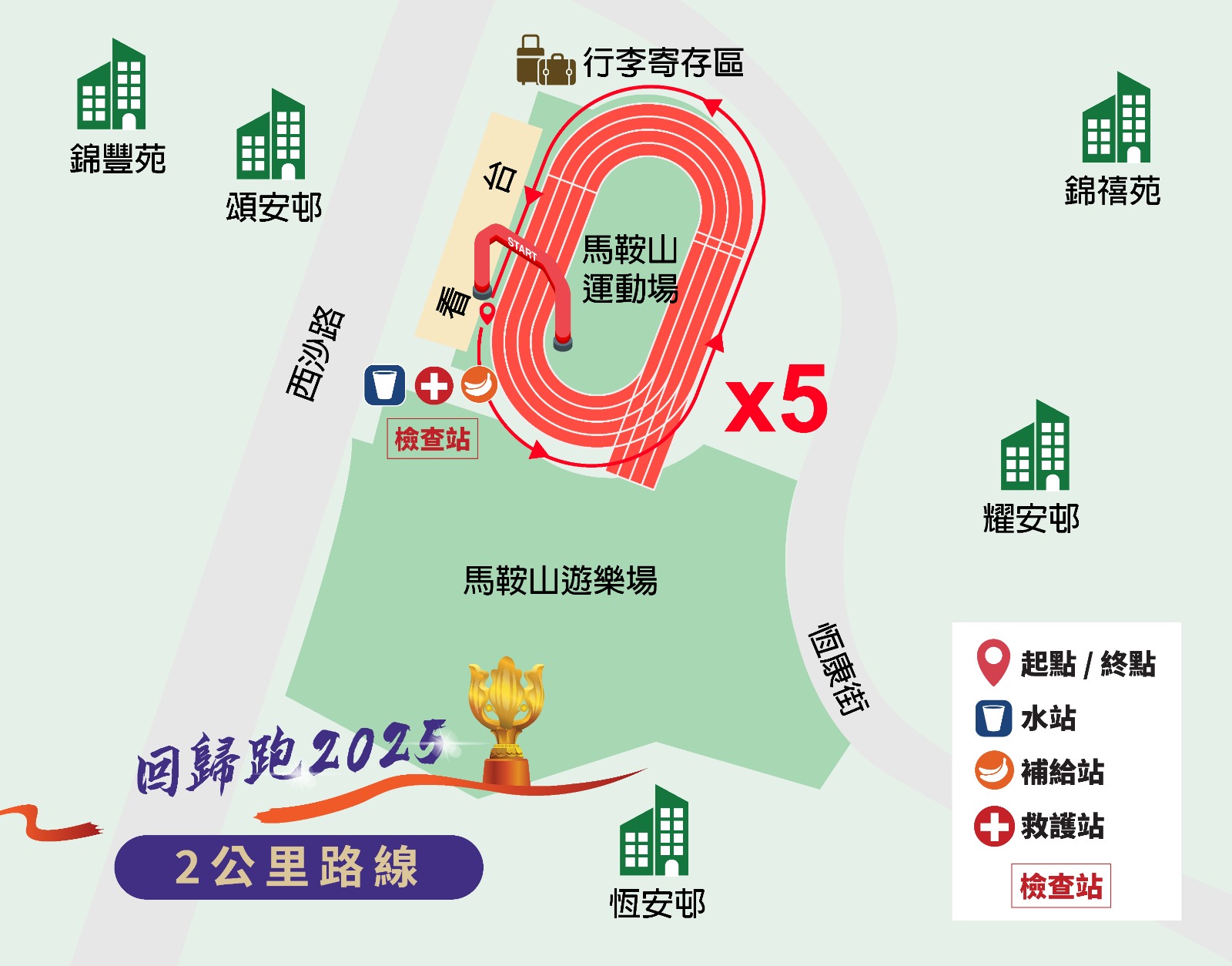 說明:下圖已公佈具體水站、檢查站、行李寄存區(詳見2KM圖,僅限存放細件行李)等情況。